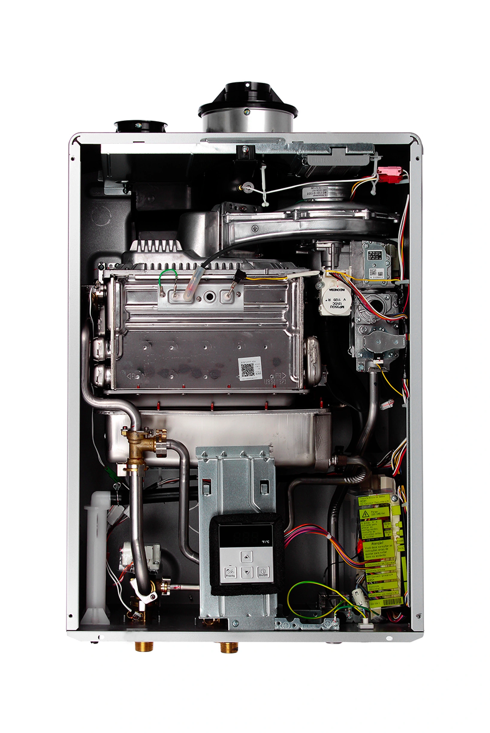 Dois trocadores de calor e válvula de gás com sistema premix, garantindo baixo consumo e emissões reduzidas de óxido nitroso.